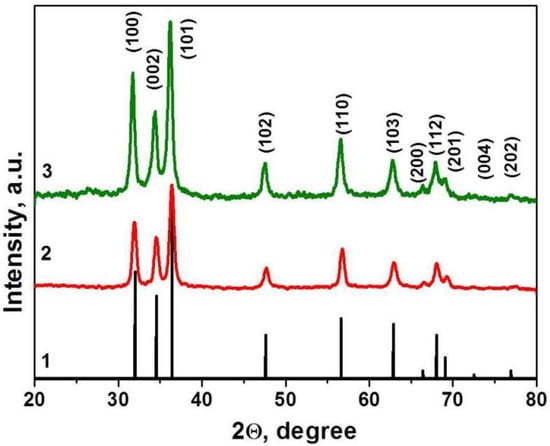 XRD patterns of ZnO–SnO2 (ZTO) films. ZnO phase (curve 1), Crystallography Open Database (COD) ID 2300113, and material 1 (curve 2), 2 (curve 3).