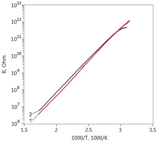 The resistance dependence of the formed structures based on ZTO film grown on the soda-lime glass substrate on the reverse temperature is shown in Figure 3. It is seen that despite the different concentrations of modifying agent, these dependencies are very close to each other for both heating and cooling curves. The observed identical nature of the resistance temperature dependence can be attributed to the presence of Na atoms in the films structure which were diffused from the substrate to the film. It is known that the activation energy of the ZnO films conductivity doped with Na can be equal to 0.8 eV [40]. In our case, this dependence was well approximated by the Arrhenius equation: