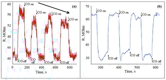 For comparison, a similar experiment was conducted for a material with a ratio of Zn:Sn = 95:5, which was applied on the aluminum oxide (polycor) substrate (Figure 4b). The response curve showed that the sensitivity to CO was slightly higher. In addition, this sample did not have a rapid deterioration in gas-sensitive properties.