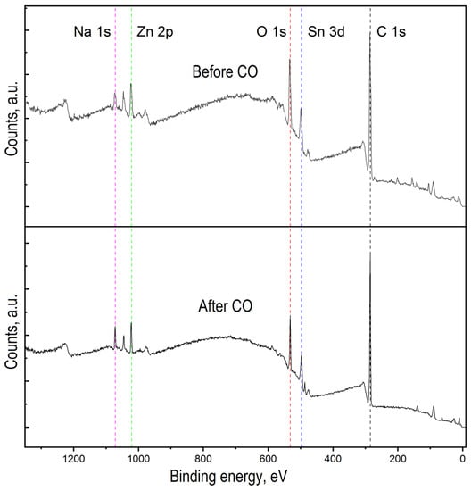 Figure 5 shows the overview spectra of ZTO film with the Zn:Sn ratio of 95:5 before and after CO treatment with a concentration of 50 ppm at a temperature of 300 °C. It can be seen that in both cases, the film surface contains the following elements: Zn, Sn, O, C, and Na. To assess the chemical composition of ZTO films through qualitative and quantitative analysis, high-resolution peaks spectra of the elements Zn 2p, Sn 2p, O 1s, Na 1s, and C 1s were studied (Figure 5 and Figure 6). Before exposure to CO, zinc and tin oxides were present on ZTO films surface (Figure 5). The presence of carbon on the ZTO film surface before CO treatment was associated with the film’s synthesis method from organic precursors, as evidenced by the high-resolution spectrum of the C 1s line, whose component composition corresponded to the C-C and C=O bonds [43,44,45,46] (Figure 6b).