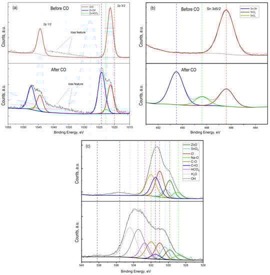 The obtained results do not refute the known facts of water molecules dissociation on the metal oxides surface with the formation of OH− groups [47,48]. The presence of OH− groups on the ZnO–SnO2 film surface leads to the formation of Zn-OH (Zn 2P peak with an energy of 1022.8 eV (Figure 6a, after CO treatment)) and Sn-OH (Sn 3d5/2 peak with an energy of 490.5 eV (Figure 6b, after CO treatment)) bonds.