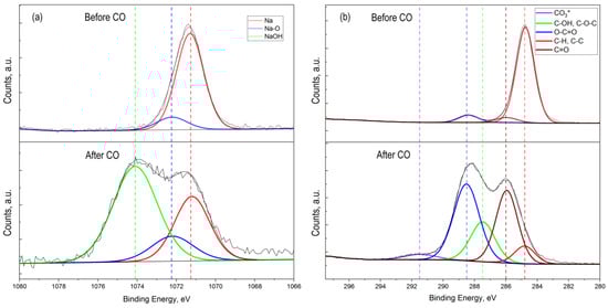 The presence of Na 1s peak in the survey spectrum for a sample that was not treated by CO (Figure 7a) indicated the initial presence of sodium in the oxide film. The presence of sodium can be explained by its diffusion from the glass into the ZnO–SnO2 film during synthesis process. In this sample, sodium was present as interstitial defects in oxides (Na* red line component at 1071.7 eV) and as Na-O bond at 1072.2 eV (Figure 7a). The presence of sodium in the film is also evidenced by the obtained energy activation of conductivity, which is close to the values reported in [40]. However, on a sample that was treated by carbon monoxide, the concentration of sodium that corresponds to interstitial defects in oxides was decreased. At the same time, a peak of Na 1s with energy of 1074.1 eV appeared, corresponding to the association of Na with the OH− group (Figure 7a, after CO treatment). Probably, Na+ cations located on the surface contributed to the sorption of water molecules from the atmosphere to form sodium hydroxide (NaOH). This was also evidenced by the high-resolution XPS spectrum for oxygen lines 1s with an energy of 533.7 eV (Figure 6c, after CO treatment).