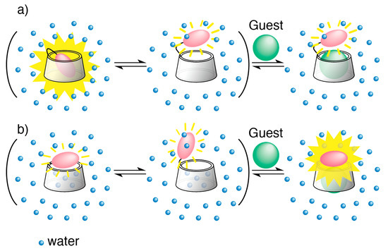Turn-off and turn-on chemosensors: (a) An equilibrium model for guest-induced conformational change in a conventional chromophore-modified cyclodextrin (turn-off CD chemosensor) in aqueous solution; (b) An equilibrium model for guest-induced conformational change in a new type of chromophore-modified cyclodextrin (turn-on CD chemosensor) in aqueous solution.