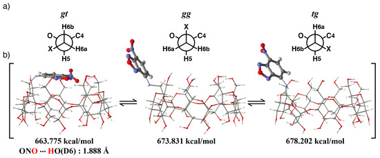At first, the stable structure of NC0βCD was studied. There are three rotatable bonds between the β-CD framework and the NBD unit, i.e., the C5-C6 bond of the glucose unit, C6-NH bond, and NH-NBD bond (Figure 6). Three local-minimum conformers existed about each bond and the number of total local-minimum conformer was at least 27. The key conformer that can change the location between the β-CD framework and NBD unit was the C5-C6 bond, i.e., gt, gg, and tg conformers (Figure 7a). The initial structures for molecular mechanics calculations were obtained by rotating the dihedral angles about the C6-NH and HN-NBD bond by 30° intervals from 0° to 360°, after the dihedral angle about the C5-C6 bond was rotated to give the gt, gg, or tg conformer. All obtained initial structures were subjected to energy minimization by MMFF94 molecular mechanics calculations.