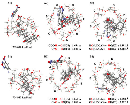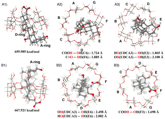 Estimated structure of the NC0βCD/UDCA complex; (A) gt conformer: (A1) side view, (A2) view from the primary hydroxy side, (A3) view from the secondary hydroxy side; (B) gg conformer: (B1) side view, (B2) view from the primary hydroxy side, (B3) view from the secondary hydroxy side.