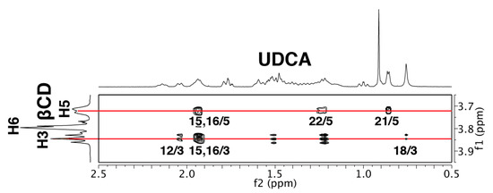 This estimated structure was supported with ROESY data (Figure 10). The ROESY spectrum indicated that the H-21, H-22, H-15, and H-16 of UDCA were closer to the H-5 of the β-CD (the primary hydroxy side), whereas the H-18, H-15, H-16, and H-12 of UDCA were closer to the H-3 of the β-CD (the secondary hydroxy side). Since the H-15 and H-16 of UDCA were located near the center of the β-CD cavity, NOE signals of both H-15 and H-16 of UDCA with both H-3 and H-5 of the β-CD were observed. The NOE signals of the H-15 and H-16 of UDCA with H-3 of the β-CD were larger than those with the H-5 of the β-CD. Although the difference between their calculated energies was small and two types of the complexes could exist in a solution, the ROESY data clearly indicated that complex (A) was the main species, while complex (B) is the minor species.