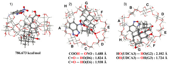 Stable structures of the NC0βCD/UDCA complex were obtained by a similar method to that employed for the βCD/UDCA complex. Since the primary hydroxy side was not covered by the NBD unit in the gg and tg conformers of NC0βCD, UDCA could easily generate a stable complex with NC0βCD, similar to its inclusion complex with native β-CD. The estimated stable structure of the inclusion complex of the gg conformer of NC0βCD with UDCA is shown in Figure 11B as an example. On the other hand, UDCA could not directly form a stable complex with NC0βCD in the stable gt conformer because the primary hydroxy side was covered by the NBD unit. The gt conformer of NC0βCD was also in equilibrium with many other conformers. The rotation around the C6-NH bond could move the NBD unit away from the primary hydroxy side, and UDCA could form a stable complex with NC0βCD, as shown in Figure 11A. Since the binding constant of NC0βCD for UDCA was over ten thousand, the NBD unit could not easily return to the primary hydroxy side.