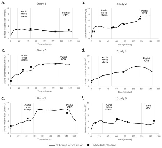 The lactate sensors are housed within the lumen towards the distal end of the 5-Fr catheter and connected to a CPU-integrated potentiostat with memory and integrated Bluetooth to record lactate levels (nA) every minute. In this study, recorded sensor output values were subsequently converted to mmol/L using a two-point conversion factor based on discrete lactate concentration values provided by a blood gas analyzer (ABL800 Flex, Radiometer America, Brea, CA, USA). Time traces of continuous lactate sensor measurements within the CPB circuits of the six piglet in vivo models are shown in Figure 2 for each study. Blood lactate levels of the piglets were allowed to equilibrate before CPB initiation (time = 0), leading to gradual increases of blood lactate concentrations via blood gas measurements and shown as solid squares in Figure 2. Lactate levels were null in the CPB circuit before CPB initiation due to non-blood recirculation. Continuous lactate sensor measurements in the CPB circuit correlated with those measured with the blood gas machine during the entire CPB, including cardioplegic ischemia and reperfusion via the application and release of the aortic cross clamp, respectively. Lactate levels measured by sensors implanted in the femoral arteries of the piglet in vivo models correlated with blood gas measurements prior to CPB initiation, previously shown in a study [58], but did not correlate during CPB. We recommend that the sensor be implanted in the CPB circuit to continuously monitor lactate during CPB, and implanted in the femoral arteries or jugular veins to monitor lactate before and after CPB. Since blood pressures measured at the femoral arteries dramatically drop during CPB due to lower blood flow, we suspect that the vessels slightly collapsed on the implanted catheter, disrupting sensor-to-blood contact.