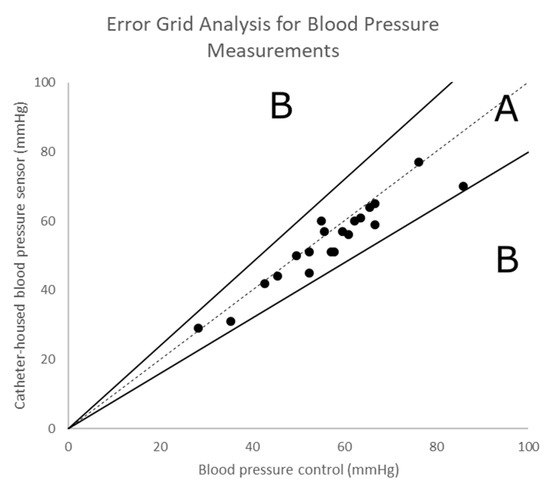 Each 5-Fr dual lumen CVC implanted in the femoral arteries had a dedicated intravenous access line connected to a blood pressure sensor to display the real-time pressure during open-heart surgery. An additional FDA-approved intravenous access line was implanted in a separate femoral artery to monitor the blood pressure as the control. The blood pressure sensor displayed the blood pressure in real-time on a monitor screen, but blood pressure measurements were not continuously annotated. These non-embedded third-party FDA-approved pressure sensors were attached to the designated lumen of our device. Discrete measurements were acquired by comparing blood pressure data acquired through our device and the control, and Clarke’s error grid analysis was performed. This analysis is typically used to quantify the clinical accuracy of blood sensors, such as those of glucose sensors [70]; the author of this study justifies why blood parameter estimates within 20% compared to reference values are clinically accurate (Figure 3). Blood pressure sensors attached to our NO-releasing sensor catheters showed a high accuracy amounting to 100% falling within the accepted Zone A and none in Zone B.