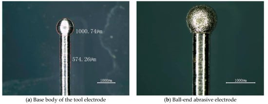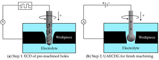In this paper, a complete process of fabricating small holes includes two steps. Step 1 is a process of electrochemical drilling (ECD) of pre-machined holes by using a helix electrode as shown in Figure 3a, step 2 is a process of UAECDG for finish machining of small holes by using a ball-end abrasive electrode as shown in Figure 3b. Both steps are conducted in one experimental set-up. In step 1, an ultra-short pulse voltage and helix electrode with high rotating speed are employed in ECD to fabricate pre-machined holes with high machining precision. Then, to avoid positional error, tool changing without repositioning is carried out after accomplishing the machining of pre-machined holes. In step 2, the UAECDG technique and passive electrolyte are employed for the finish machining of small holes.