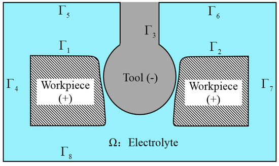 where is the applied voltage, and are the boundaries of workpiece, is the boundary of tool, – are the boundaries of electrolyte, and is the unit normal vector to the surface.