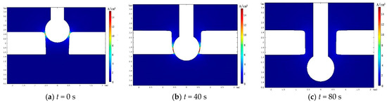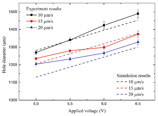 Figure 11 shows the impact of voltage and feed rate on hole diameter by simulation and experiments. Both simulation and experiments indicate that the hole diameter increases with applied voltage but decreases with feed rate, which is according with Equation (13). When the feed rate is constant, the higher applied voltage, the higher current density in the machining, and the ability of the electrochemical reaction is stronger to remove the materials so that the hole diameter is larger. On the contrary, when the applied voltage is constant, the machining time of the electrochemical reaction decreases with the feed rate so that the hole diameter decreases with feed rate. On the other hand, the experiment results show that the repeat machining precision is worse with higher applied voltage and lower federate because the machining gap increases with applied voltage but decreases with the feed rate which is consistent with Equation (12).