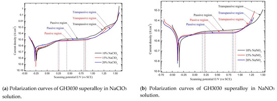 NaClO3 solution and NaNO3 solution are typical passive solutions. As shown in Figure 6, the polarization curves of GH3030 superalloy in NaClO3 solution as well as NaNO3 solution are characterized by active dissolution, passivation, and trans passivation. Within the passive region, the passive oxide film has been generated on the surface of metal material and the current density relatively remains constant. Figure 6a shows the polarization curves of GH3030 superalloy in 10–20% NaClO3 solutions. It is obvious that the passive potential ranges of GH3030 superalloy in 15% and 20% NaClO3 solutions are wider, meaning that the stable passivation is more likely to occur on the surface of GH3030 superalloy in 15% and 20% NaClO3 solutions. GH3030 superalloy has a passive potential range of 0.24 to 0.83 V in 15% NaClO3 solution and 0.26 to 0.84 V in 20% NaClO3 solution.