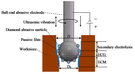 Figure 7 shows the schematic diagram of UAECDG. The diameter of pre-machined hole is slightly smaller than the diameter of the ball-end. The materials removal in UAECDG is determined by a compound machining process composed of ECM and mechanical machining. The machining gap of UAECDG can be divided into ECM stage, ECG stage, and secondary electrolysis stage. Only in the ECG stage, abrasive particle can remove the remove the passive oxide film which adverse to ECM, so that the most materials removal appears at the stage of ECG.