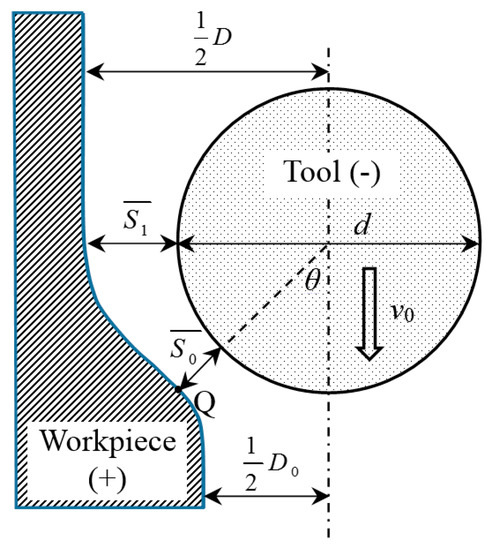 Figure 8 schematically depicts the diagram of machining gap in UAECDG. It can be assumed that the phase of ECG begins from point Q. The position of Q is mainly determined by the diameter of pre-machined hole, the diameter of ball-end, tool feed rate, and applied voltage. When the process of UAECDG at a stable state, the machining gap S0 at point Q can be approximately expressed as: