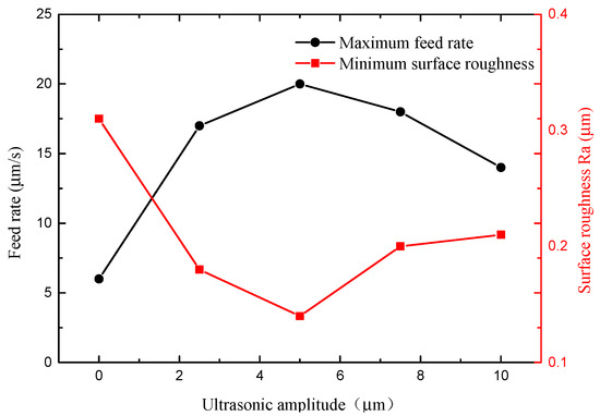 Variation in maximum feed rate and minimum surface roughness Ra with ultrasonic amplitude.