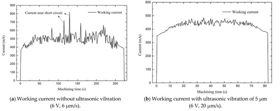 In addition, it is indicated from Figure 9 that the surface roughness decreases obviously by applying ultrasonic vibration to tool electrode. It is because the tool electrode with ultrasonic vibration can promote removing of electrolysis products and refreshment of the electrolyte in machining gap, which makes the flow field more uniform and improves the machining stability. Figure 10 shows the current signals in UAECDG with and without applying ultrasonic vibration on tool electrode. As shown in Figure 10a, the machining process without ultrasonic vibration applied is not stable enough because of the small machining gap and difficulty in taking away the electrolysis products in time. When ultrasonic vibration is applied to the tool electrode, the working current is more stable and a short circuit can be effectively avoided as shown in Figure 10b, therefore the holes with low surface roughness Ra can be obtained.