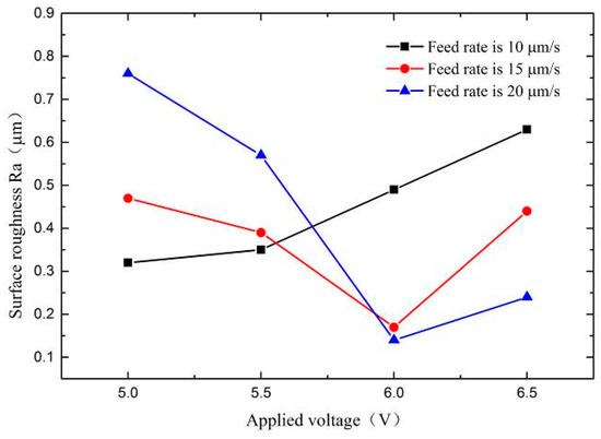 Figure 12 shows the effect of voltage and feed rate on the surface roughness of holes. It is indicated that the surface quality mainly depends on the matching between the applied voltage and feed rate. When low feed rate and high voltage are applied, the mechanical grinding in UAECDG is not working because the machining gap is too large, and the material is totally removed by electrochemical reaction.