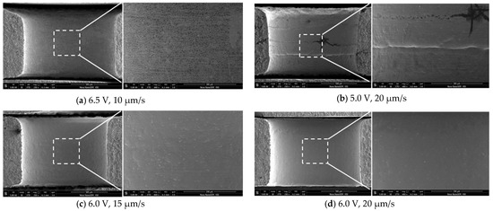 The seriously stray corrosion occurs at the entrance of holes and the surface quality is suffered from the stray corrosion and pitting corrosion, which cause a poor surface quality as shown in Figure 13a. When high feed rate and low voltage are applied, the mechanical grinding is excessive and scraping the metal directly because of the too small machining gap, which cause an unstable machining process and even short circuit. The surface quality is damaged from the scratch produced by mechanical grinding as shown in Figure 13b. Only if the feed rate and voltage are balanced well will the holes have a good surface quality as shown in Figure 13c,d.