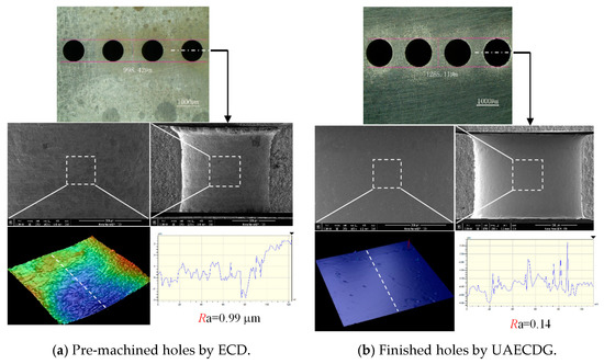 The parameters are optimized as follows: the applied voltage is 6 V, the feed rate is 20 μm/s, and the ultrasonic amplitude is 5 μm. By using the optimized parameters, a set of small holes with high repeat machining precision and surface quality are obtained. Figure 14 shows the diameter of the small holes is enlarged from 998 μm to 1265 μm. Benefiting from the applying of ball-end electrode, the machining localization is improved and the hole taper is obviously reduced by limiting the electrochemical reaction to the zone near the ball-end of electrode, which is consistent with simulation results. When the reasonable federate, voltage, and ultrasonic amplitude are applied, the UAECDG with a suitable machining gap has a good machining efficiency and stability. The side wall of the small hole is straighter and smoother after UAECDG along with the surface quality is improved from Ra 0.99 μm to Ra 0.14 μm. Figure 14a shows the pre-machined holes by ECD, Figure 14b shows the finished holes by UAECDG.