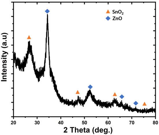 The XRD pattern shows the crystallographic structure and phase purity of the SnO2/ZnO thin film, as shown in Figure 3. The diffraction displayed sharp, clear, and strong diffraction peaks, that are well matched with the rutile-like structure of SnO2 (JCPD # 41-1445) and hexagonal wurtzite phase of ZnO (JCPD # 36-1451), respectively [18]. Moreover, no impurity peaks were observed; that is a clear indication for the formation of SnO2/ZnO heterostructures.