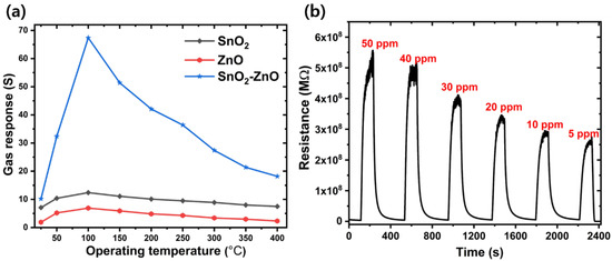 For MOS gas sensors, operating temperature plays a dynamic role in determining the gas response of gas sensor. It is because of the dependence of desorption, and adsorption procedures of O2 molecules takes place on the surface of the sensor [22]. Hence, first we examined the gas response of pure SnO2, ZnO, and SnO2/ZnO heterostructure samples towards NO2 gas at various operating temperatures fluctuating from 25–400 °C, and the result is presented in Figure 5a. The gas response is increased in all the three cases, reached to the maximum value and then rapidly decreased. The optimum operating temperature was about 100 °C, as can be seen in the Figure 5a. Moreover, compared to their mono-counterparts the SnO2/ZnO exhibits about a six times higher gas response towards NO2 gas. The enhanced gas response in the instance of SnO2/ZnO may be credited to the formation of heterostructures. At lower working temperatures gas kinetics is low and results in a lower sensor response. Similarly, at higher working temperatures, more than optimal working temperature, the kinetics of gas species more than that of molecules, might seepage from their active sites of the surface, formerly the reaction, and would disturb the amount of adsorbed gas. Henceforth, they are subsequent in a low sensor response. At optimal working temperature (100 °C) the sensor response is higher which might be because of more surface interactions and oxygen vacancies. The consequences also display the outcome of crystallinity reliant on sensing performances for thin-film gas sensors wherever higher crystallinity achieves an enhanced sensor response. The dynamic gas response of the SnO2/ZnO heterostructures sensor to various NO2 concentrations varies from 5–50 ppm, as displayed in Figure 5b. The gas response is increased with a rise in NO2 gas concentration. The sensor exhibits a noticeable gas response from 26.4 towards 5 ppm NO2 with very rapid response-recovery times of around 20 s and 45 s, respectively.