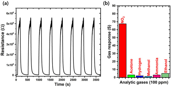 (a) Eight cycles of response–recovery curves towards 50 ppm NO2 at the operating temperature of 100 °C, (b) selectivity measurements of SnO2/ZnO heterostructures towards various test gases with concentrations of 100 ppm.