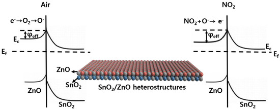 These results exhibited that SnO2/ZnO heterostructures have better gas response compared to their mono counterparts. The improvement in gas response for SnO2/ZnO heterostructures can be credited to subsequent features. At first, the surface of SnO2/ZnO heterostructures leads to both oxides being highly available for adsorption of the O2 species, resulting in the creation of a depletion layer onto the surface. Thus, synergetic effects of the oxides perhaps donate the improvement of the gas response in comparison to their mono counterparts. Then, work functions of SnO2 and ZnO that have stated 4.9 eV and 5.2 eV, respectively, results in the formation of heterojunctions among SnO2 and ZnO [26]. Shown in Figure 7, is the schematic of energy band diagrams of the SnO2/ZnO heterojunction in dry air and NO2 gas. The flow of electrons form SnO2 to ZnO till the fermi levels (FE) are balanced. This generates an e− depletion layer onto the ZnO and bend SnO2 energy band that results in a change in electrical resistance of SnO2/ZnO heterostructures. As a sensor was exposed to NO2 gas at the optimal operating temperature, trapped e− were sent back to the CB of SnO2/ZnO heterostructures because of the reaction between adsorbed O2 species and NO2 molecules. Therefore, electrical resistance of SnO2/ZnO heterostructures was highly increased resulting in an enhanced gas response.