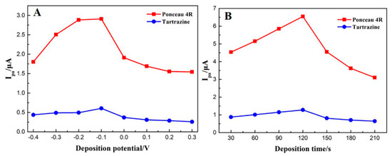 Effect of deposition potential (A) and deposition time (B) on the DPV anodic peak currents of ponceau 4R and tartrazine. (A) Deposition time was set at 150 s and (B) deposition potential was fixed at −0.1 V.
