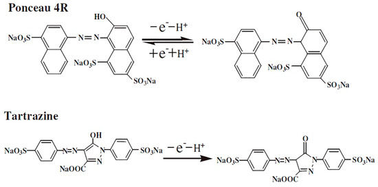 Cyclic voltammograms of ponceau 4R and tartrazine at various scan rates are illustrated in Figure S1. The symmetric redox peaks of ponceau 4R suggest that ponceau 4R underwent a quasi-reversible process. In contrast, no cathodic peak of tartrazine was found at the reverse scan, indicating tartrazine underwent a totally irreversible process. Notably, both Ipa (PR) and Ipa (TZ) increased steadily as the scan rates increased from 0.03 to 0.3 Vs−1. In addition, the redox peak currents of ponceau 4R and tartrazine (Ipa or Ipc) increased linearly with the square root of scan rates (Figure 6A,B), suggesting the reactions of ponceau 4R and tartrazine are typical diffusion-controlled processes. As the potential scan rate grew up, the anodic peaks shifted positively while the cathodic peaks moved towards the reverse direction. The redox peak potentials (Epa or Epc) were highly correlated with natural logarithm of scan rates (Figure 6C,D). According to Laviron theory [53], the slope values of Epa-lnv and Epc-lnv plots are equivalent to RT/2αnF. Generally, α is assumed as 0.5 for a quasi-reversible or irreversible electrode reaction. Therefore, the electron transfer number (n) was estimated to 0.95 (≈1) and 1.19 (≈1) for ponceau 4R and tartrazine, respectively, implying one electron participation in the electrooxidation of ponceau 4R and tartrazine. Therefore, it can be inferred that the electrooxidation mechanisms of ponceau 4R and tartrazine involved one electron (1 e−) transfer coupled with one proton (1 H+). The possible electrooxidation mechanisms are illustrated in Figure 7. On the TiO2/ErGO/GCE, the hydroxyl groups in ponceau 4R and tartrazine were oxidized to carbonyl groups with releasing 1 e− and 1 H+, which are in good agreement with the previous reports [19,20,22,54].