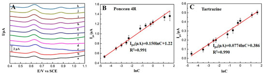 (A) DPV curves of ponceau 4R and tartrazine with their concentrations varying from 0.01 to 5.0 μM, a→k: 0.01, 0.003, 0.05, 0.08, 0.10, 0.30, 0.50, 0.80, 1.0, 3.0 and 5.0 μM; (B) plots of the anodic peak currents of ponceau 4R as the function of the natural logarithm of its concentrations in the range of 0.01–5.0 μM (n = 3) and (C) plots of the anodic peak currents of tartrazine as the function of natural logarithm of its concentrations in the range of 0.01–5.0 μM (n = 3).