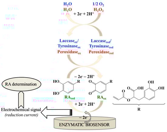 Laccases are multicopper oxidases, also named “blue” copper oxidases, widely distributed in the nature (from bacterial species to fungi and plants [67]), that catalyze the oxidation of mono–, di–, poly–phenols (including RA), amino–phenols, methoxy–phenols, aromatic amines and ascorbate, through the four-electron reduction of molecular oxygen to water [16,66,68]. Similar to laccase, tyrosinase catalyzes, in the presence of oxygen, the oxidation of the o–phenols to the corresponding o–quinone [62].