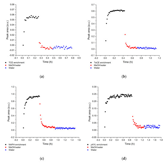 After each measurement, the polymer membrane was recovered using a mixture of MeOH and deionized water 1:10 (v/v) following a flushing of solely deionized water. Since the sensor has to be quickly ready for further operation, the maximum flow rate of 12 mL/min was applied. Figure 6 exemplarily shows the regeneration process (decreasing peak area vs. time) after enriching NAPH in a concentration of 25 ppm. The coefficients for the exponential fit of the regeneration curve are given in Table 6. As with the enrichment process, the regeneration is diffusion-controlled. Therefore, depending on the analyte and its concentration, time until complete removal varies. Regeneration times, i.e., until the initial peak area is achieved, reach from 10 to 30 min. In Figure 7, the entire measurement cycle for four analytes with a concentration of 15 ppm (a) TCE, (b) TeCE) and 25 ppm (c) NAPH, (d) pXYL) is illustrated. Black represents the diffusion into the E/P-co polymer, red is the polymer recovery using MeOH/water, and blue is associated with the flushing of water to remove MeOH residuals. The overall measurement time is around 1 to 1.5 h, afterwards, new measurements can be performed.