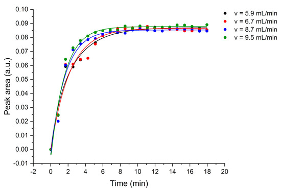 Finally, the influence of different speed velocities of the peristaltic pump was investigated. Enrichment curves at four different flow rates (black: 5.9, red: 6.7, blue: 8.7, and green: 9.5 mL/min) were recorded. This is exemplary shown for 15 ppm EB in Figure 8. A summary of the exponential fit functions and -values are given in Table 7. As expected, the time is higher when applying higher flow rates, however, this is not a significant difference. The results obtained are still in an acceptable time-range, i.e., 4 to 5 min. Furthermore, a minimum increase in peak area was observed when applying higher flow rates resulting from an increased mass transfer due to an increased contact with analytes molecules. Therefore, the equilibrium concentrations at the four respective flow rates were exemplarily plotted in Figure 9 (a: TCE, b: mXYL, 15 ppm each) revealing no significant difference between the four flow rates. This behavior was already observed previously by Yang et al. [31]. All VOCs above a vapor pressure of 1 Torr showed no significant influence of the flow rate on the equilibrium concentrations. However, if the flow rate is set too high, the polymer membrane may rupture causing leakages.