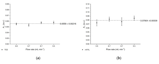Comparison of equilibrium concentrations of TCE (a) and mXYL (b) each in a concentration of 15 ppm at four different flow rates: 5.9, 6.7, 8.7, and 9.5 mL/min. After achieving steady-state conditions, 10 repetitive measurements were performed. The dashed line represents the calculated mean value of the four flow rates.