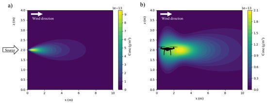 Figure 1a represents the distribution, in the absence of the drone, of the pollutant. It was obtained with the following: An emission mass flow rate of 1 g/s, a height of 2 m, conditions of neutral atmospheric stability, and a wind velocity of 1 m/s in a positive x direction. In the presence of a source of turbulence, the distribution of the pollutant is clearly affected. To determine the impact of the UAV passing close to the source of the pollutant, detailed dynamic fluid investigations would be required. For example, the one-equation Spalart–Allmaras of the Reynolds-Averaged Navier–Stokes turbulence model is one of the models commonly used to compute the turbulent eddy viscosity (TEV) [19,20]. The model gives TEV as result of a transport equation for a viscosity-like variable depending on turbulence production, dissipation, and diffusion of source terms. High-fidelity computational aerodynamics of multi-rotor UAV have shown that the maximum TEV is experienced in the areas directly below the turbine blades [21]. In this area, a turbulent mass flow of area moves vertically downwards with a lateral distribution, which is slightly larger than the size of the vehicle. Therefore, we can consider that there is an additive effect on σy and σz with a Gaussian dependence on distance according to the equation: