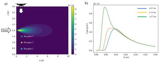 The physical meaning of K is related to the amount of turbulence induced by the drone below its airflow column. Indeed, it is related to the speed of rotation of the blades. Actually, the speed of rotation when in flight does not vary significantly; therefore, K can be considered to depend, in first approximation, mainly on the vertical distance between the vehicle and the point (placed below it) where the amount of turbulence is evaluated. If the drone is placed vertically at great distance from the receptor, K tends to zero. Conversely, K tends to be very high when close to the receptor. In fact, the closer it gets, the higher K tends to be. Figure 2 shows the effect of the increase of K, that is, of the drone proximity to the pollutant source, on the concentration of pollutant detected by three receptors placed at a distance of 1 m from the source along the x-axis and at heights of 0.5 m, 1 m, and 1.5 m on the z-axis, respectively. When the value of K is zero, that is, when the drone is far away from the source, the effect of the air vehicle is negligible and, under these simulated conditions, the concentration of the pollutant at the receptors is negligible. On the other hand, when K increases with the approach of the UAV, which fixes at its position x,y as it lowers along the z-axis towards the height at which the source is located, the pollutant is forcefully transported to the receptors. Indeed, Figure 2b shows an increase in the concentration detected by the receptors up to a maximum, above which the air is cleansed as the vehicle approaches. Although the turbulence induced by the drone is traced in an approximate way, our theoretical evaluations clearly indicate that with drone-mounted sensors the localization of pollutant source as well as its spatial distribution mapping is, to varying degrees, distorted and that this distortion depends on both the drone and receptor position.