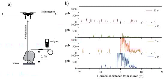 Given the results of the simulations, we decided to perform on-site analyses for the spatial distribution of pollutant concentration by means of UAV. Figure 3a schematically illustrates the experimental setup. A source of pollutant (a gasoline tank) was placed on the ground. A hydrocarbon analyzer was placed above it at a distance of 1 m, in which (in a quiet wind condition of <2 m/s) the concentration of hydrocarbons in the air is expected to be very low (<30 ppb). The pollutant concentration plots in Figure 3b were determined during UAV scans at variable heights.