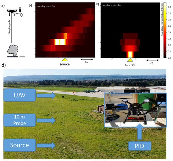 Figure 3b shows that, when the drone flies at low heights (2 and 5 m), turbulent flows transport the pollutant toward the analyzer, thus significantly increasing the detected concentration. On the other hand, there is a height beyond which the effect of the drone passage is negligible. It was, therefore, necessary to implement an appropriate measuring system enabling the real-time, space-resolved detection of pollutants while avoiding turbulences induced by the drone. The approach proposed by us was to place the analyzer on the drone equipped with a long sampling probe that allows it to capture, by means of a pump, the volume of air to be analyzed from a zone that is not influenced by the drone (Figure 4a). Obviously, for a correct determination of the source position it is necessary to consider the delay in the determination of the substance due to the time required to travel through the sampling tube. However, knowing the flow rate of the suction pump and the size of the probe, it is possible to shift the detection time of the appropriate delay. By connecting the GPS position of the UAV, it was possible to reconstruct the mapping. Figure 4b,c reports the normalized concentration intensity false-color maps. Please note that the density of analysis points along the x-axis is much higher than along the z-axis. This is due to the fact that along the x-axis the density of points depends on the analysis capability of the sensor placed on the drone (one analysis every 10 s), while along the z-axis the pixel size depends on the distance between successive drone scans (about every 1.5 m).