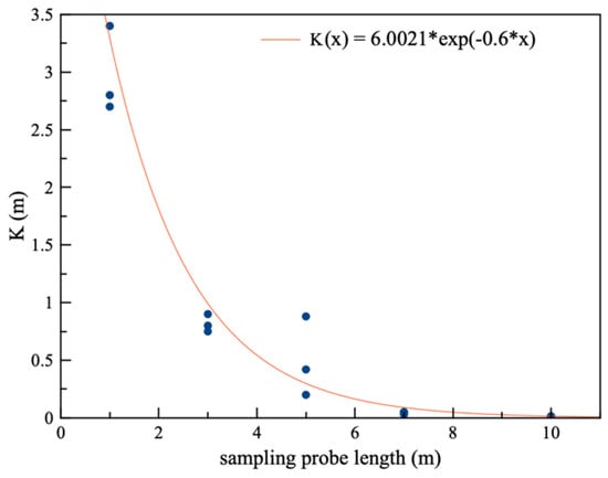 K value as a function of the sampling probe length. The red line draws the exponential best fit.