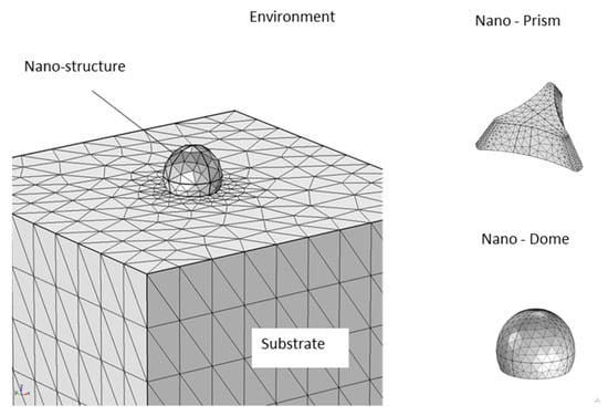 Schematic illustration of the geometry and the mesh elements distribution used for the simulation of Au nano-prism and nano-domes.