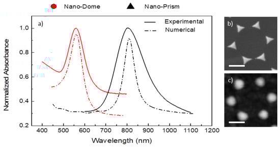 (a) Comparison of the calculated and the experimental normalized absorbance of a highly ordered array of gold nano-prisms and nano-domes; high-magnification AFM images of these structures are reported in Figure (b,c), respectively. The scale bar is 250 nm.