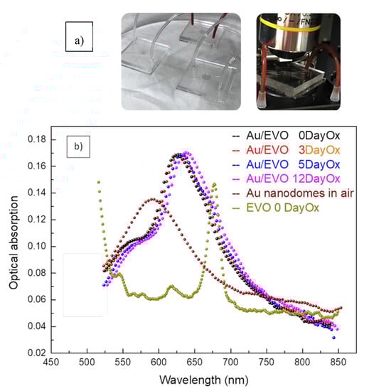 (a) Experimental set-up and microfluidic chips used during the experimental optical measurements (b) Optical absorption measurements in the UV-VIS spectral range performed on EVO oil at different oxidation states. Optical absorption of the nanodomes’ array in dry air and of the EVO oil are reported.