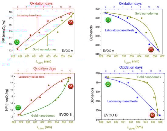 Each EVOO oil sample under investigation was sent into the microchannel by using an automatic micro-syringe device and the optical absorption curves registered in the spectral range between 550 and 850 nm. The optical data were registered by monitoring oils samples treated at different oxidation days (from zero to twelve days 0DayOx–12DayOx). As one can see, the typical localised plasmon resonance peak in the nanostructured transducer underwent a red shift due to the different chemical environment around the nanostructures. In the figure, a typical optical absorption spectrum of the Au nanodomes’ transducer in dry-air and a typical absorption curve of the pure EVOO oil at zero oxidation days are also reported. The behaviour of the LSPR peak in the nanostructures in contact with the EVOO oil can be stressed as an envelope between the LSPR plasmonic peak and EVOO oil optical absorption. A red shift in these optical envelopes is monitored by changing EVOO oil quality in contact with the nanodomes, thus demonstrating the potentiality of his new sensing probe. A comparison between the position of the typical LSPR peak as a function of the peroxide number and oxidation days compared with the measurements of the number of peroxides and biphenols, carried out in a classical analysis laboratory, are reported in Figure 6. To this purpose, as concerns the tests in a certified laboratory of analysis for biophenols, an NGD C89-10 (by HPLC) method was used, whereas, as concerns the spectrophotometric constants (Delta K, K232, K268): Reg. CEE 2568/1191 11/07/1991 GU CEE L248 05/09/1991 All. IX Reg. UE 1833/2015 12/10/2015 GU UE L266/29 13/10/2015 All III), the values were obtained by spectrophotometer analysis. On the contrary, as regards peroxide number, we used the titration methodology, following the rules CEE 2568/1991 11/07/1991 GU CEE L248 05/09/1991 All III Reg UE 1784/2016 30/09/2016 GU UE L273 08/10/2016.