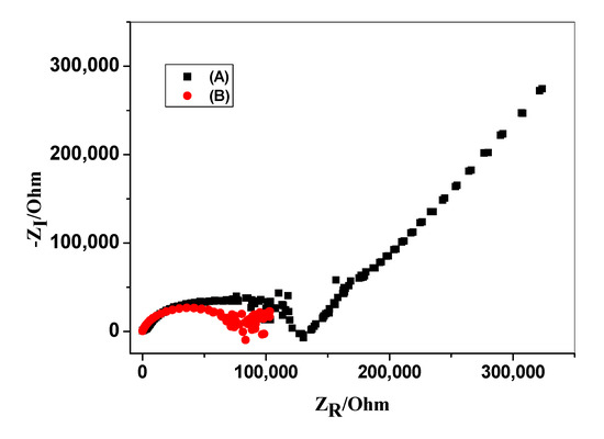 Electrochemical impedance spectra of (A) un-modified and (B) modified bilirubin sensors. Conditions: frequency range 100 kHz–10 mHz; 50 μM BR solution.