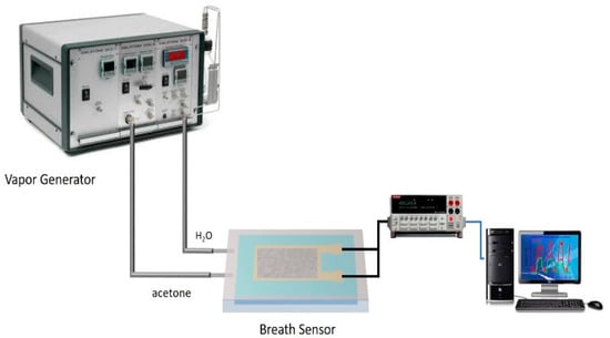 The acetone vapor and RH can be generated and controlled through an OVG-4 vapor generator and humidity generator, OHG-4 (Owlstone Inc., Westport, CT, USA), as shown in Figure 1. The vapor generator was designed to generate trace concentrations of gases precisely. For example, using OVG-4 vapor generator, we can obtain variable concentrations of acetone vapor ranging from 0.1 ppm to 5.6 ppm with controlled RH levels from 8% up to 85%. The sensing test has been conducted to detect variable concentration of acetone at a certain RH under the room temperature. The change in resistance across the film was measured using the Keithly electrometer. RH and temperature were monitored using a commercialized sensor. The concentrations of acetone vapor used in this study is 2.85 ppm with 10%, 50% and 70% RH conditions, respectively, at the room temperature. To conduct the experiment, baseline resistance of the sensors at room RH (between 20%–40%) was measured and recorded, as R1. The generated acetone and water vapor are delivered through carrier gas from OVG-4 and OHG into the sensing chamber.