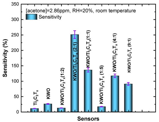 The sensing performance of as-fabricated device to detect acetone is based on a room-temperature chemiresistive response. That is, the detection and sensing response of acetone largely depend on sensing material’s chemical, electrical and structural properties. These properties play an important role to affect charge transfer between sensing material and detected gas, and electrons/holes diffusion within the nanocomposite. This results in a change in resistance of sensing material [38,39]. As shown in Figure 4, comparing to other nanomaterials, the KWO/Ti3C2Tx (2:1) nanocomposite exhibits the highest sensitivity (almost 10 times higher than the response of KWO) to 2.86 ppm acetone at the same sensing condition, RH = 20% and room temperature. Although the detailed sensing mechanism is still under investigation, the improved sensing performance of KWO/Ti3C2Tx (2:1) nanocomposite can be considered due to the contributions of (1) the unique surface and electric properties of Ti3C2Tx nanosheets [38,42], which can provide better signal to noise ratio and higher sensitivity, (2) the room temperature of ferroelectric property of KWO [22], and (3) the interaction between KWO and Ti3C2Tx makes stronger (002) facet. Here, 2D multilayered Ti3C2Tx nanosheets not only provide extreme large surface and interface area for the absorption of acetone molecules but also the rich surface functional groups, Tx (–O, –OH, and –F). These can be the active sites for the nucleation and growth of the KWO nanorods to enhance the interfacial interactions between KWO and Ti3C2Tx and expedite charge transfer and transportation.