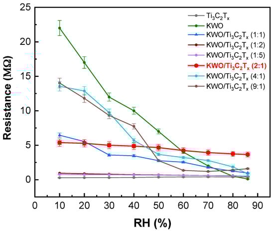 To evaluate the tolerance of humidity, the KWO/Ti3C2Tx (2:1) nanocomposite-based sensor has been tested under different level of relative humidity (RH) at the room temperature. The result is shown in Figure 5. The nanocomposite, KWO/Ti3C2Tx (2:1) nanocomposite shows relative stable baseline resistance (red color) while RH is from 10% up to 86%. Considering the less influence of RH but much higher sensitivity to acetone, KWO/Ti3C2Tx (2:1) nanocomposite shows the best sensing response to acetone at room temperature. The selectivity of KWO/Ti3C2Tx (2:1) nanocomposite-based sensor can be evaluated via referring to the selectivity of KWO-based sensors, which has been studied in other work [24].