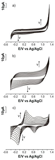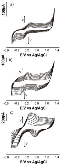Figure 1. Cyclic voltammograms obtained with modified screen-printed carbon electrodes (SPCEs) in 10−1 M KCl solution with scan rates in the range 0.1–1.0 V × s−1: (a) CoPc-SPCE; (b) MB-SPCE; (c) PB-SPCE.
