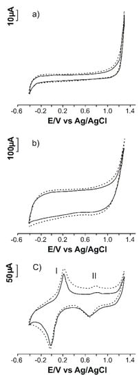 The influence of the scan rate on the voltammetric responses of the sensors was achieved by recording the cyclic voltammograms of the modified SPCEs in 10−1 M KCl solution with scan rates in the range 0.1–1.0 V × s−1. The results obtained are shown in Figure 1.